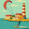 Póster artístico de Adícora, reinterpretado con alma venezolana. Kitesurf, casas costeras y faro en una pieza de arte impreso que evoca libertad, viento y color caribeño. Ideal para decoración de pared con estilo vintage tropical.