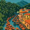 Barquitos dormidos bajo palmas gigantes. Esta obra retro evoca la magia tropical de Choroní, donde la selva y el mar se funden en una sola postal nostálgica.
