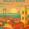 Historia, sol y arquitectura colonial. El puente y la catedral se funden en tonos dorados al atardecer, recordando el corazón del Orinoco con estilo vintage.