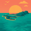Arte impreso de Los Roques con puesta de sol y mar turquesa. Póster tropical ideal para decorar con esencia venezolana, perfecto para amantes del Caribe, los viajes y la estética vintage.