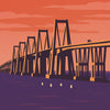Póster gráfico del Puente sobre el Lago de Maracaibo al atardecer. Arte impreso vibrante que celebra la arquitectura icónica zuliana. Ideal para decoración moderna con sabor venezolano.