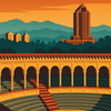 Modernismo y tradición taurina. Este arte combina el ícono arquitectónico de la ciudad con su plaza de toros, entre sombras y naranjas cálidos. Capital industrial con alma gráfica.